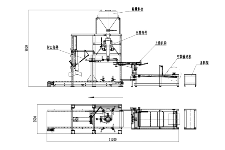 全自動(dòng)機(jī)器上袋氧化鋁噸袋包裝機(jī)主要機(jī)構(gòu):氧化鋁空袋輸送機(jī)構(gòu)、自動(dòng)上袋機(jī)構(gòu)、氧化鋁自動(dòng)稱量機(jī)構(gòu)、氧化鋁自動(dòng)灌裝機(jī)構(gòu)、自動(dòng)熱合封口、自動(dòng)噴碼打印、氧化鋁自動(dòng)輸送機(jī)構(gòu)。簡(jiǎn)略圖紙如下: